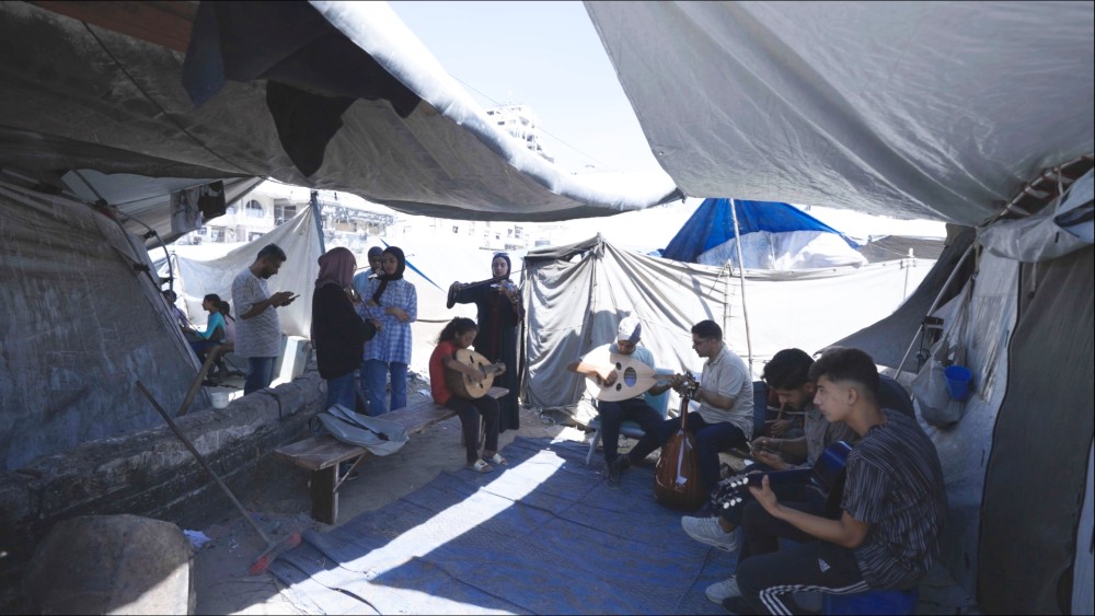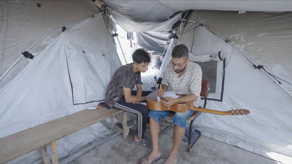 そんな避難生活の中で、アハマドは「音楽でこの不安を吹き飛ばせないか」と考えるようになった。彼はかつて共にエドワード・サイード音楽院で働いていた仲間の音楽家たちと協力し、子どもたちに楽器や歌を教える活動を始めた。