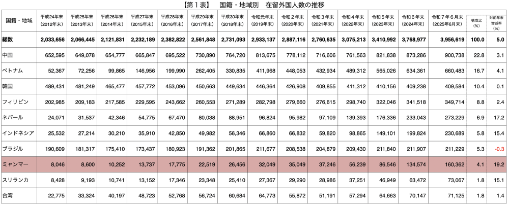 (参照:出入国在留管理庁「令和7年6月末現在における在留外国人数について」)